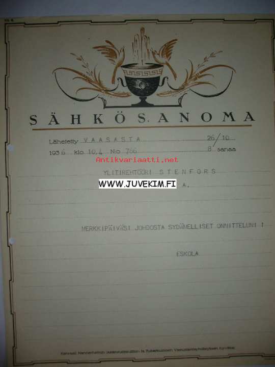 Ylitirehtööri Stenfors Vaasa 26.10.1936 -sähkösanoma