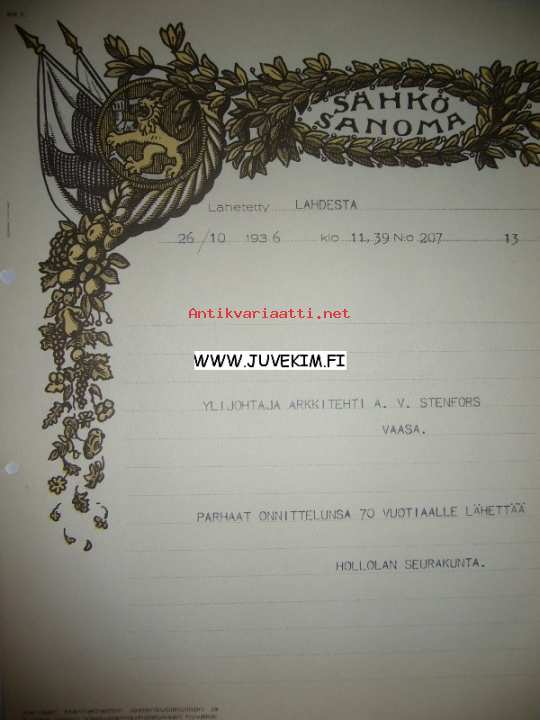 Ylijohtaja Arkkitehti A. V. Stenfors Vaasa 26.10.1936 -sähkösanoma