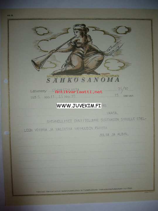 Ylitirehtööri Stenfors Orimattila 26.10.1936 -sähkösanoma