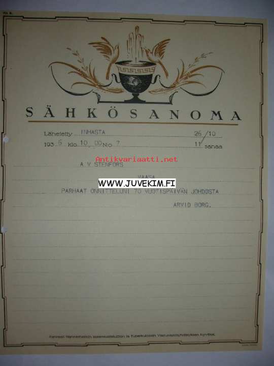A. V. Stenfors Inha 26.10.1936 -sähkösanoma