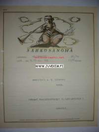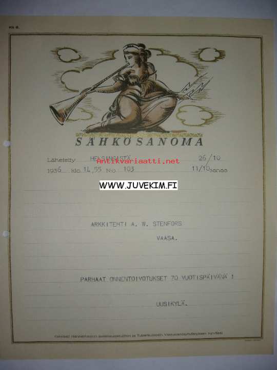 Arkkitehti A. V. Stenfors Helsinki 26.10.1936 -sähkösanoma
