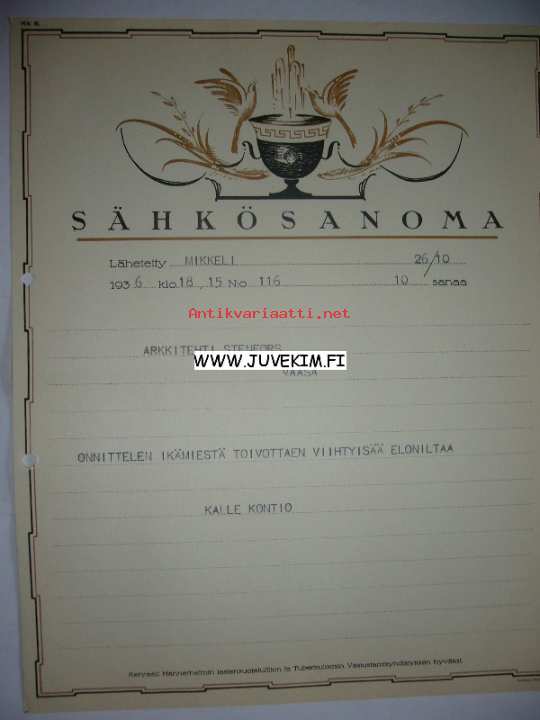 Arkkitehti Stenfors Mikkeli 26.10.1936 -sähkösanoma