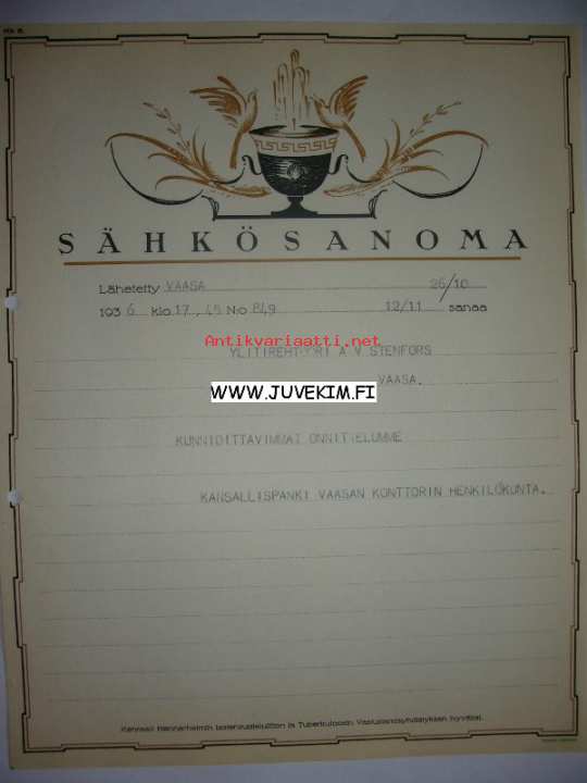 Ylitirehtööri A. V. Stenfors Vaasa 26.10.1936 -sähkösanoma