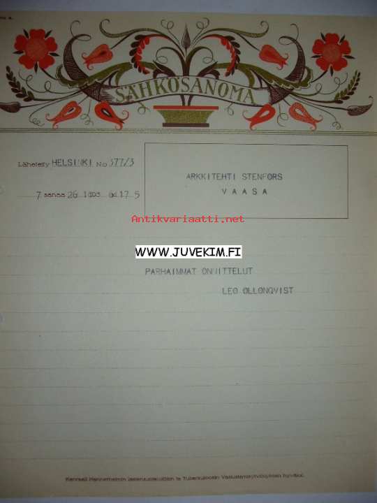 Arkkitehti Stenfors Helsinki 26.10.1936 -sähkösanoma