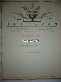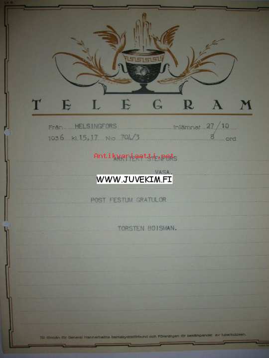 Arkkitekt Stenfors Helsinki/Helsingfors 26.10.1936 -sähkösanoma