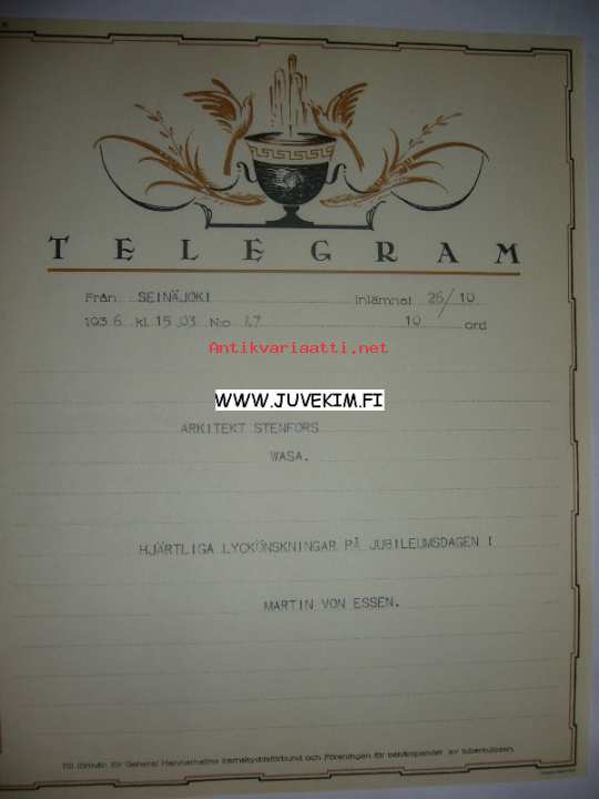 Arkitekt Stenfors Seinäjoki 26.10.1936 -sähkösanoma