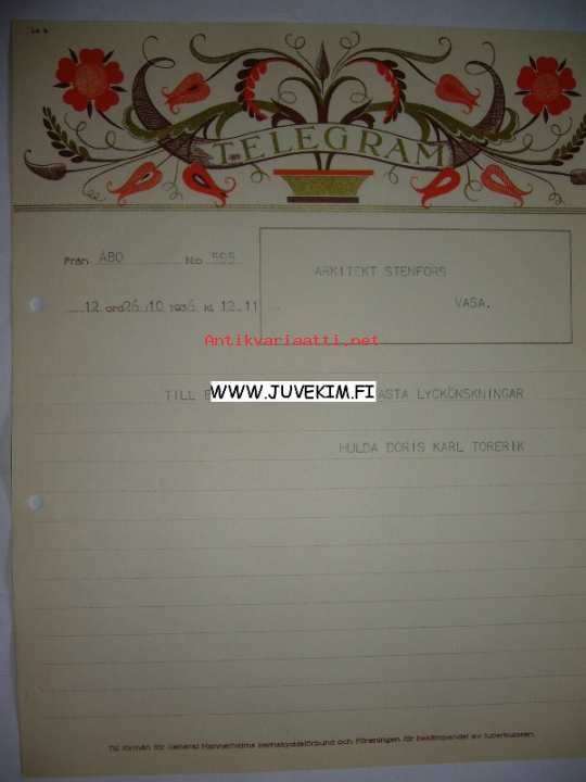 Arkitekt Stenfors Åbo 26.10.1936 -sähkösanoma