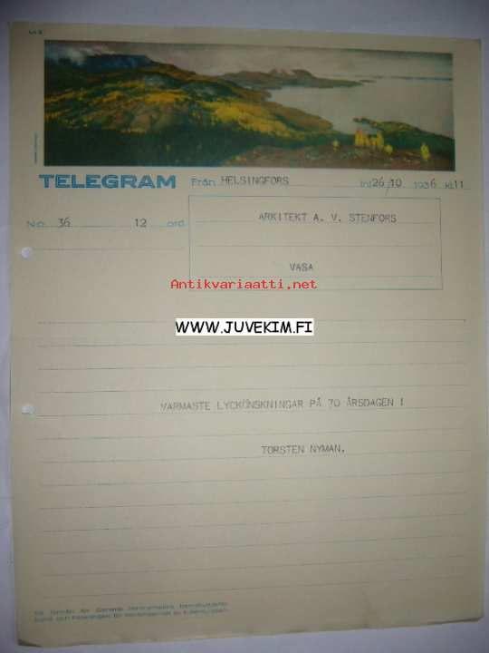 Arkitekt A. V. Stenfors Helsingfors 26.10.1936 -sähkösanoma