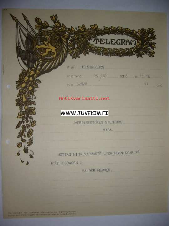 Överdirektören Stenfors Helsingfors 26.10.1936 -sähkösanoma