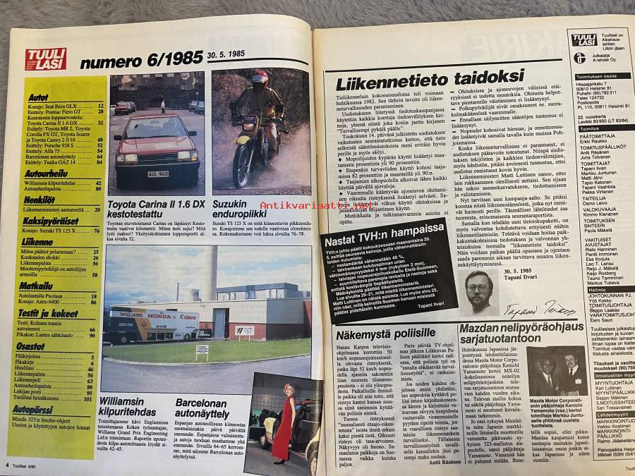 Tuulilasi 1985 nr 6 - Testi: Kolmen tonnin auto-stereot, kestotesti: Toyota Carina II, Koeajo: Seat Ibiza, Autopörssissä: Mazda 323:n huolto-ohjeet, ym.