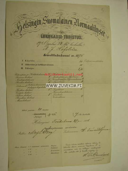 Helsingin Suomalainen Normaalilyseo lukukausitodistus 1898 A.J. Hofström