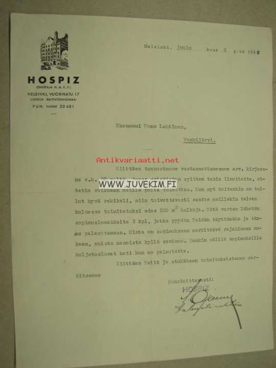 Hotelli Hospiz 3.12.1943 -asiakirja