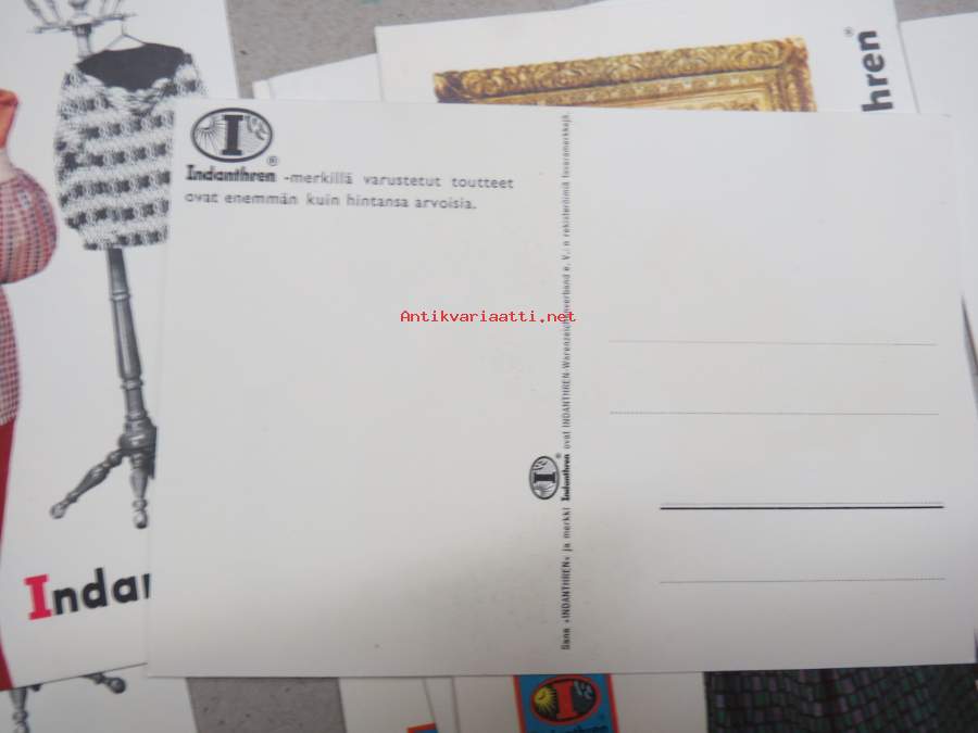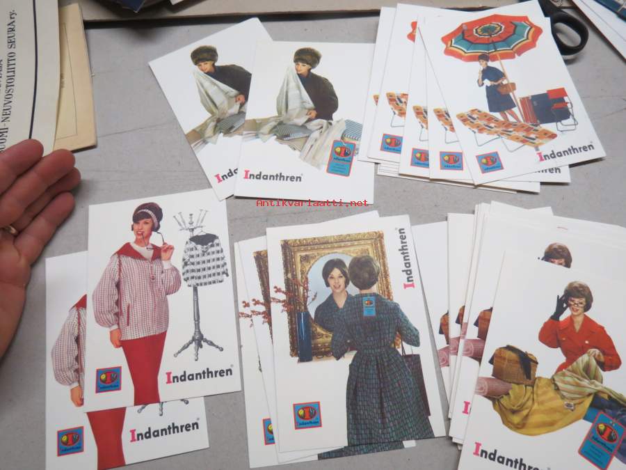 Indanthren -mainospostikortteja yli 30 kpl, suomenkielinen taustateksti, täysin käyttämättömiä
