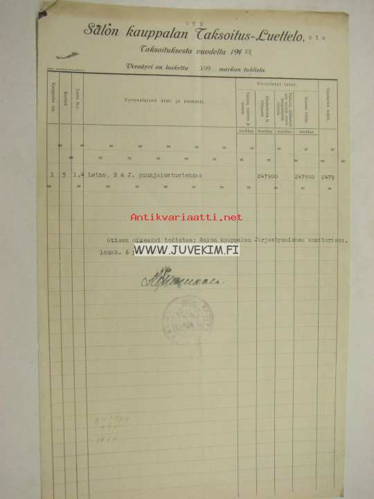Salon kauppalan taksoitusluettelo E & J Leino puunjalostustehdas 1923 -asiakirja
