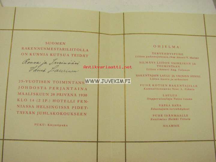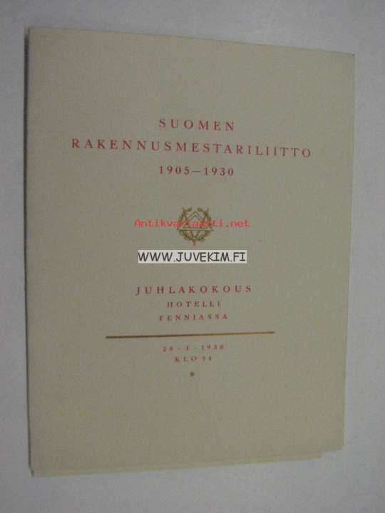 Suomen Rakennusmestariliitto 1905-1930 -juhlakokouskutsu Hotelli Fennia