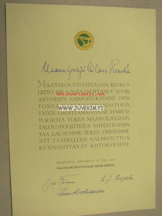Maataloustuottajain Keskusliitto -kunniakirja Olavi Puuska Kuusjoki