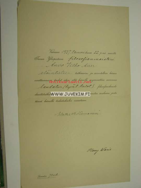 Auvo Wilho Auer -yliopistotodistus 22.1.1937