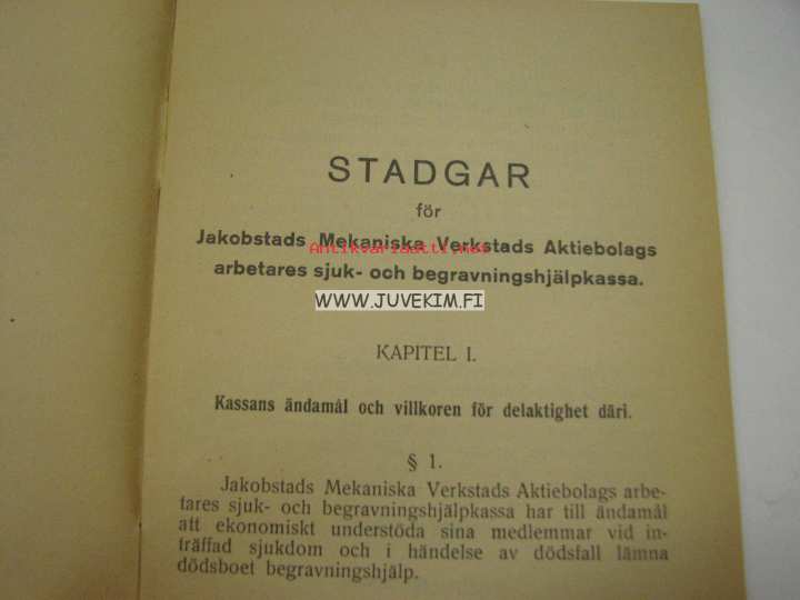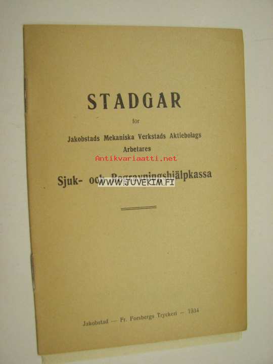Stadgar för Jakobstads Mekaniska Werkstads Aktiebolags Arbetares Sjuk- och Begravningshjälpkassa 1934