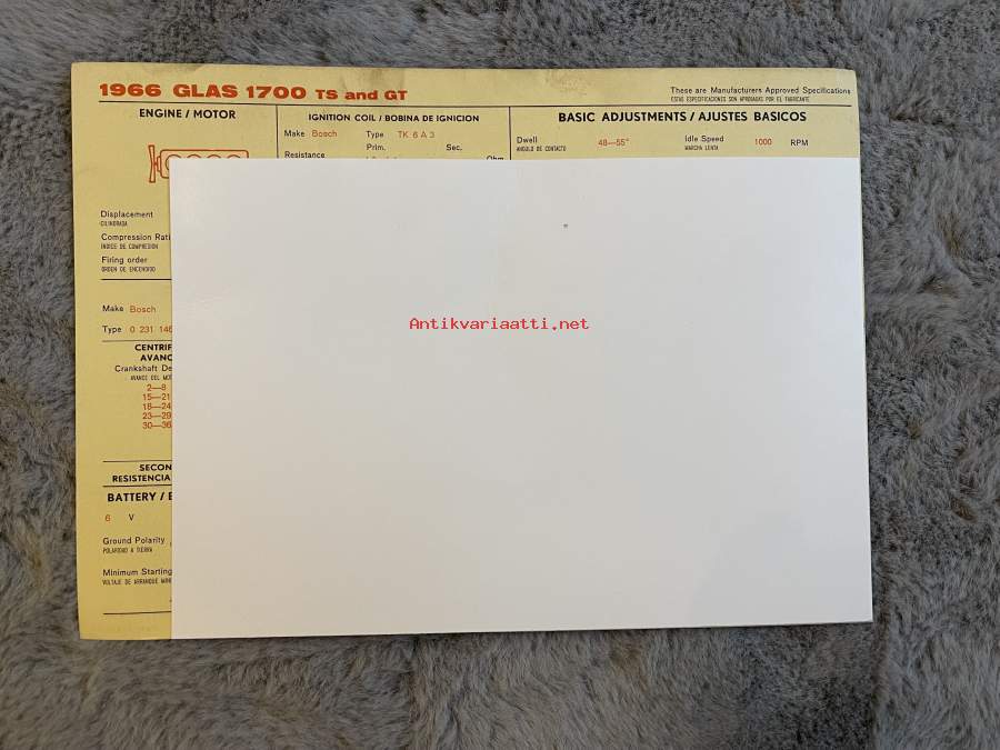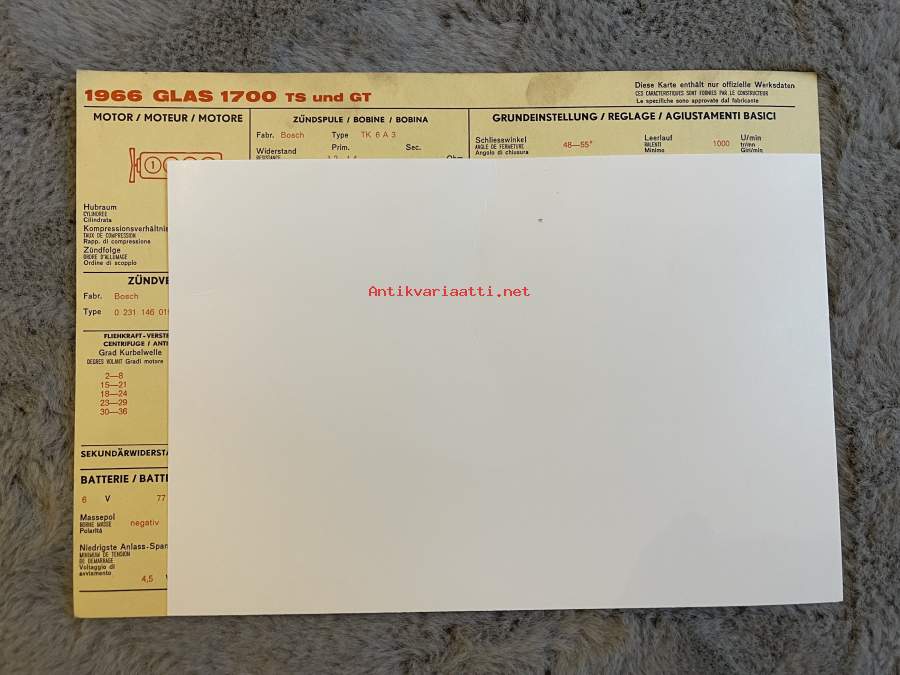 Glas 1700 TS ja GT 1966 - säätöarvokortti / säätöarvot, monikielinen -technical specifications, multilingual
