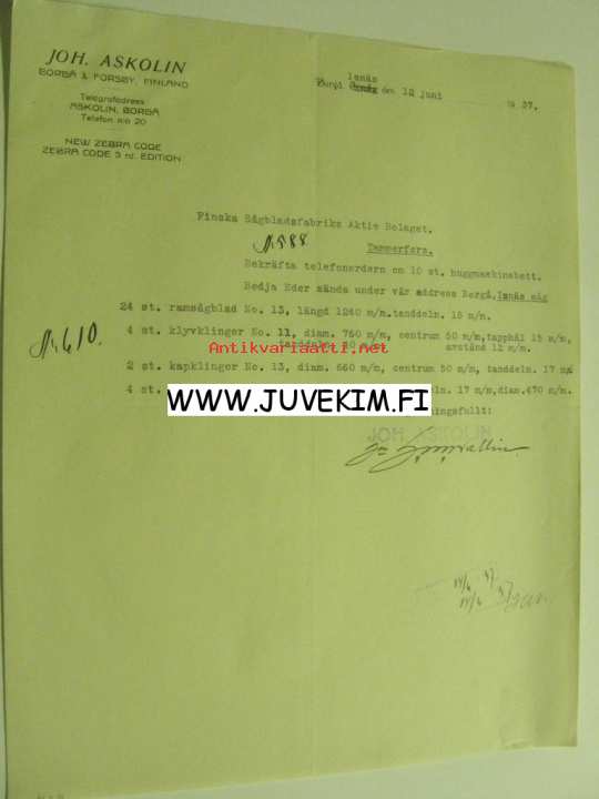Joh. Askolin, Porvoo 12.6.1937 -asiakirja