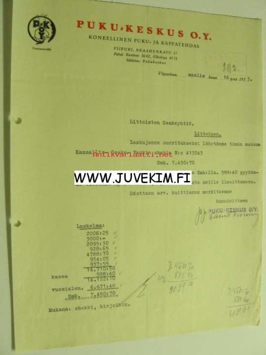 Puku-Keskus O.Y, Viipuri 16.3.1933 -asiakirja