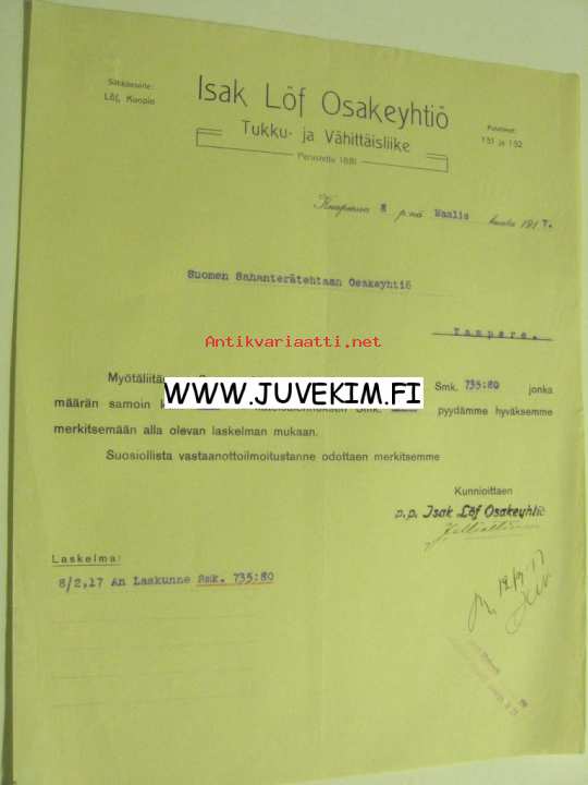 Isak Löf Osakeyhtiö, Kuopio 8.3.1917 -asiakirja