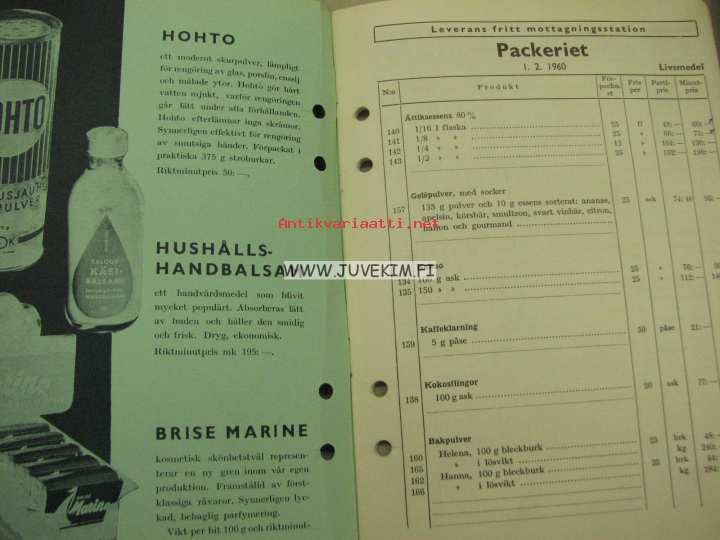 Packeriet och Teknokemiska Fabriken Prislista 1.2.1960 -hinnasto