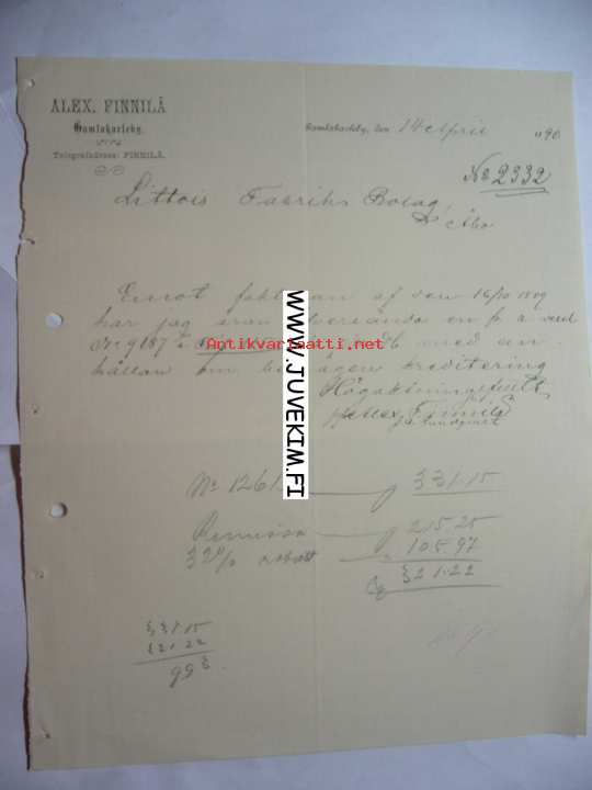 Alex Finnilä Gamlakarleby/Kokkola 14.5.1890 -asiakirja
