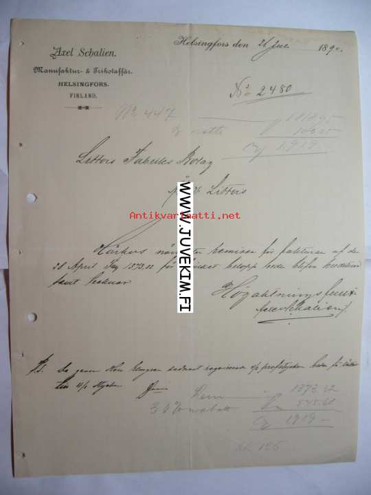 Alex Schalien Helsingfors/Helsinki 26.7.1890 -asiakirja