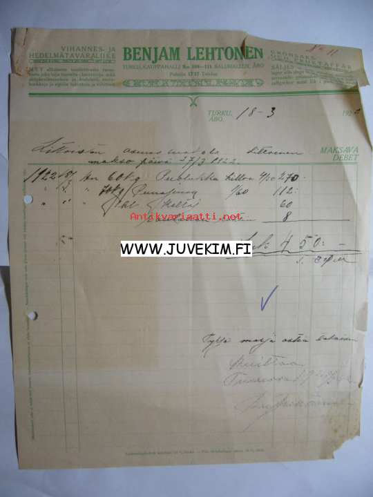 Benjam Lehtonen Turku/Åbo 18.3.1922 -asiakirja