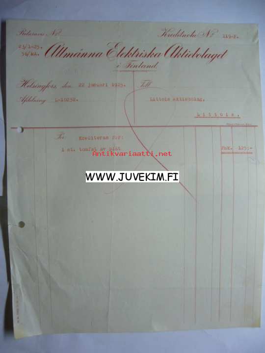 Allmänna Elektriska Aktiebolaget Helsinki/Helsingfors 22.1.1925 -asiakirja
