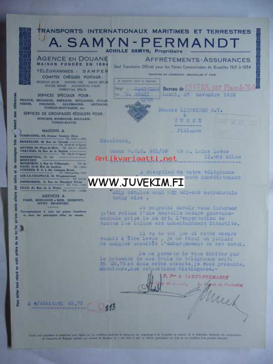 A. Samyn -Permandt Anvers 27.11.1939 -asiakirja