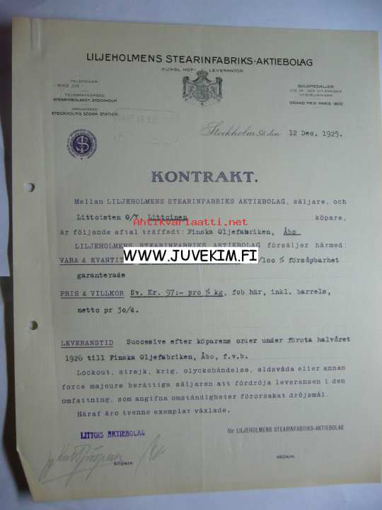Liljeholmens Stearinfabriks Aktiebolag Stocholm 12.12.1925 -asiakirja