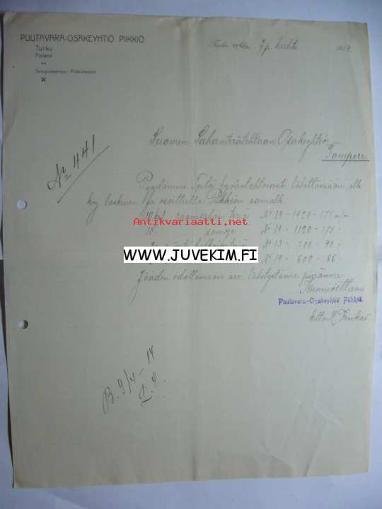 Puutavara-Osakeyhtiö Piikkiö Turku 7.4.1914 -asiakirja