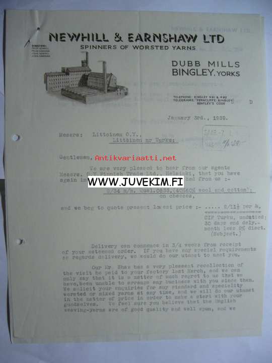 Newhill & Earnshaw Ltd Bingley, Yorks 3.1.1939 -asiakirja
