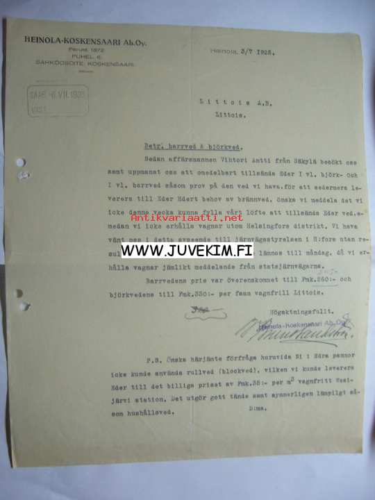 Heinola-Koskensaari Ab. Oy. Heinola 3.7.1925 -asiakirja