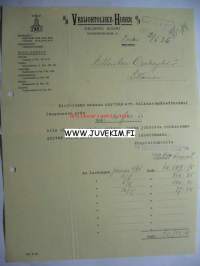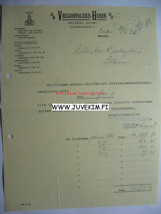 Vesijohtoliike Huber O/Y Turku 12.5.1926 -asiakirja