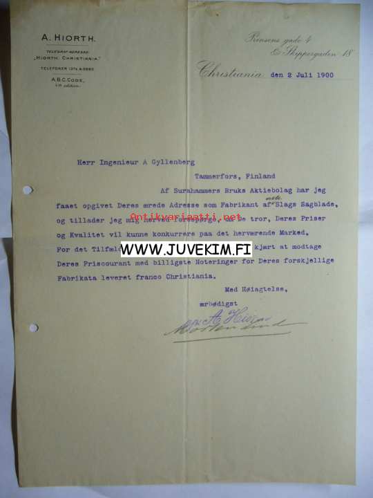 A. Hiorth Christiania 2.7.1900 -asiakirja