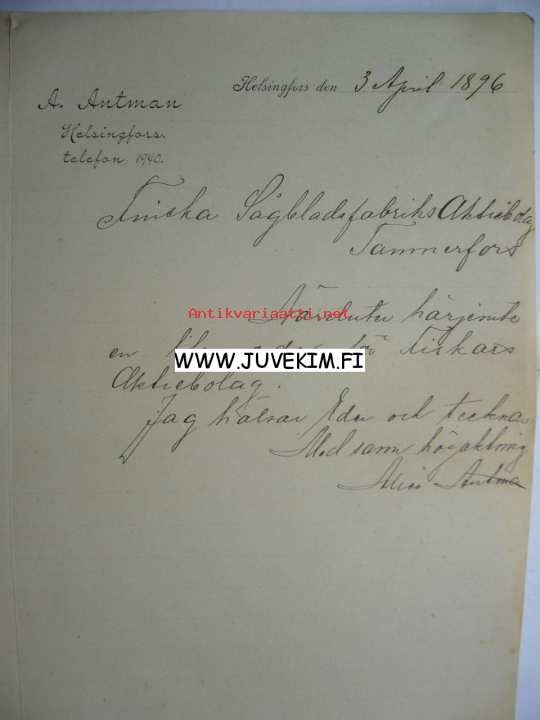 A. Antman Helsingfors 3.4.1896 -asiakirja