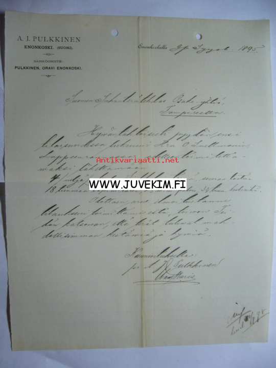 A. J. Pulkkinen Enonkoski 26.9.1895 -asiakirja