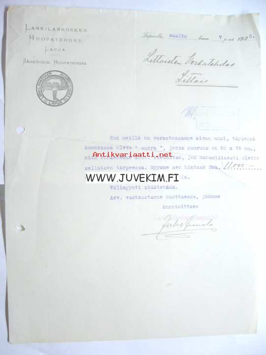 Lankilankosken Huopatehdas Lapua 7.3.1923 -asiakirja