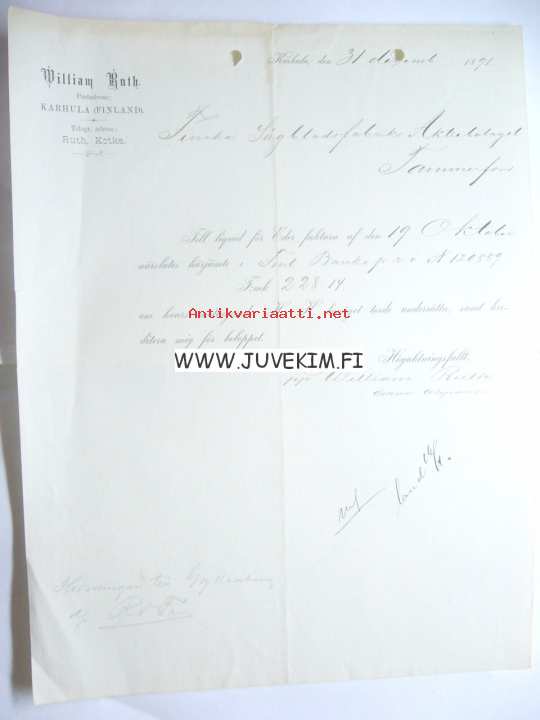 William Ruth Karhula 31.12.1891 -asiakirja