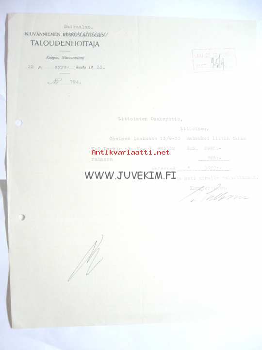 Niuvanniemen Sairaalan Taloudenhoitaja Kuopio 22.9.1933 -asiakirja