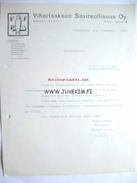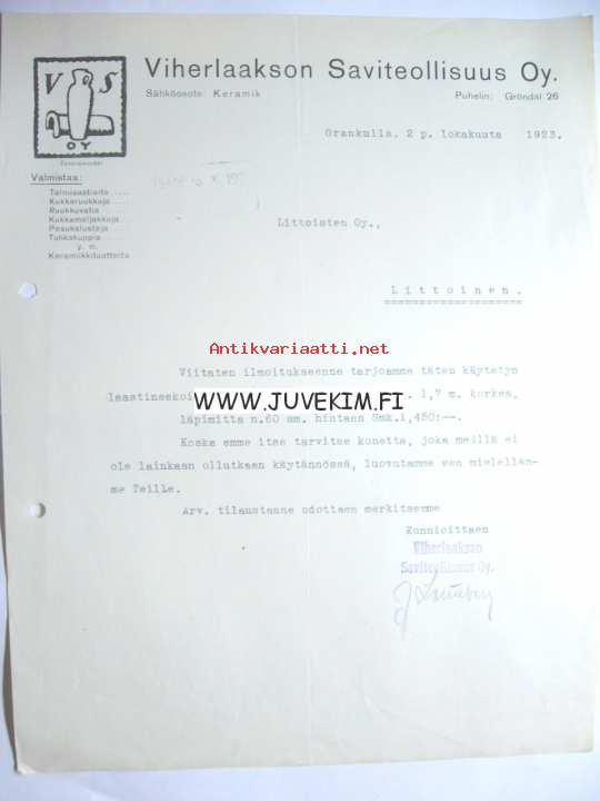 Viherlaakson Saviteollisuus Oy. Grankulla 2.10.1923 -asiakirja