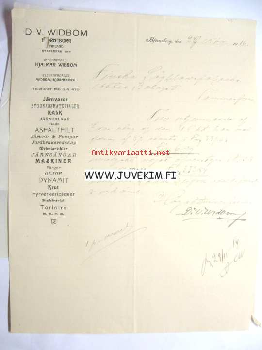 D. W. Widbom Björneborg 26.11.1916 -asiakirja