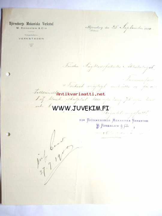 Björneborgs Mekaniska Verkstad Björneborg 25.9.1900 -asiakirja