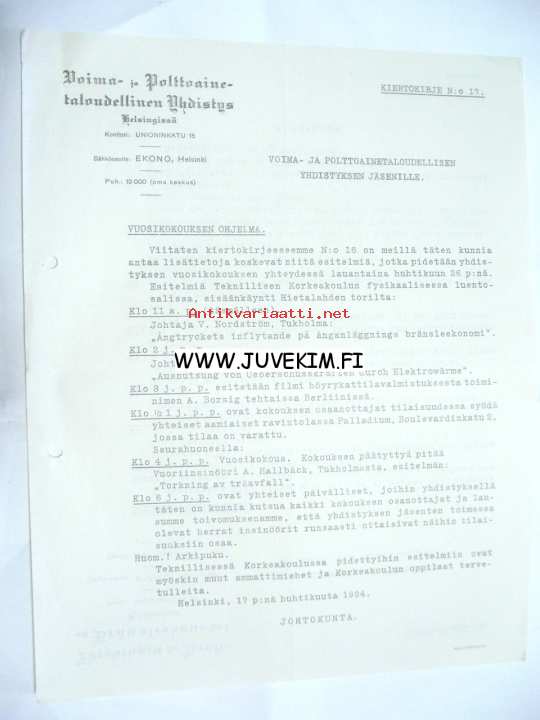Voima- ja Polttotaloudellinen Yhdistys Helsinki 17.4.1924 -asiakirja