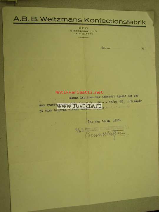 AB B. Weitzmans Konfectionsfabrik Turku 26.10.1926 -asiakirja