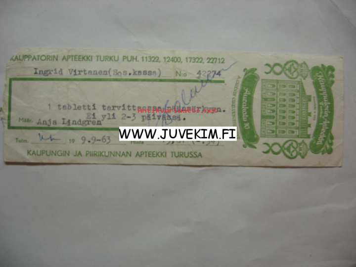 Kauppatorin Apteekki Turku 1963 -signatuuri