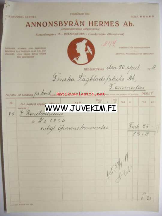 Annonsbyrån Hermes Ab. Helsingfors/Helsinki 20.4.1914 -asiakirja